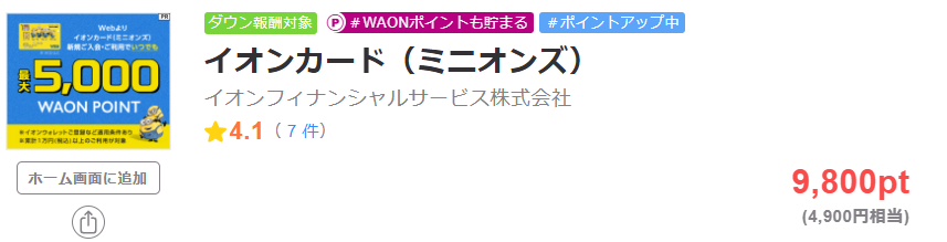 例えば本記事作成時点(2026年2月17日)では、ちょびリッチというポイントサイトを経由してイオンカードセレクト(ミニオンズ)を作成で公式特典とは別に4,900円相当のポイントが獲得できます。