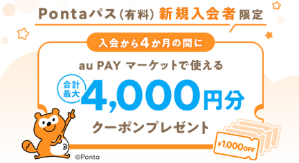 - auPAYマーケットで使える最大4,000円クーポン(単純に最初の3カ月は会費を払っても黒字、詳細はこちら)