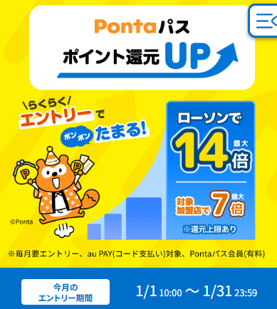 1月はローソンのauPAY払いで最大ポイント14倍、対象Ponta提携社でも最大ポイント7倍です(要エントリー、500pt/月上限)。
