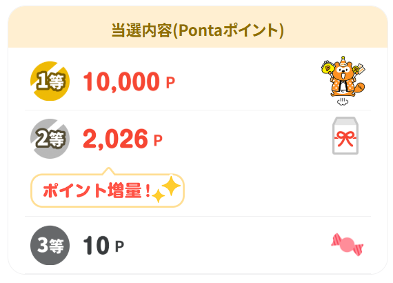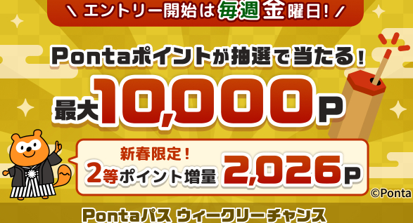 毎週金曜日の10:00~翌週木曜日の23:59までにエントリーすることで、毎週総額1,000万Pontaポイントがあたる抽選のキャンペーンです。