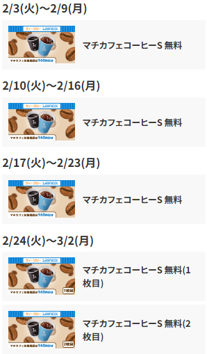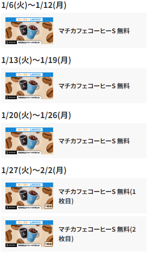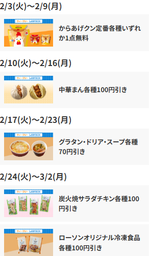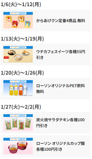 - ウィークリーLAWSON (毎週無料クーポンや半額クーポンがもらえる)