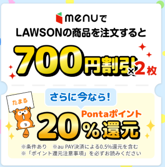 また、menuで使えるローソン700円引きクーポン2枚配布(毎週)が配布+今なら春のPontaパス祭りでPontaポイント最大20%還元も実施中です。