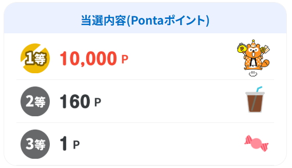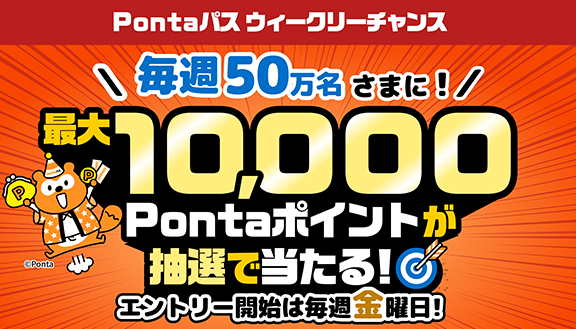 毎週金曜日の10:00~翌週木曜日の23:59までにエントリーすることで、毎週総額10,000万Pontaポイントがあたる抽選のキャンペーンです。