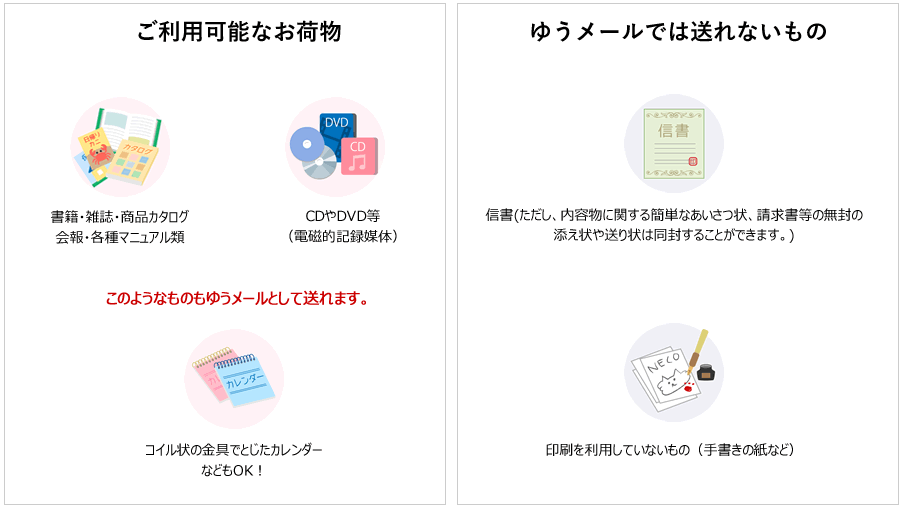 実質はゆうメールと同じサービスになるため、送れるものがかなり限定的です。