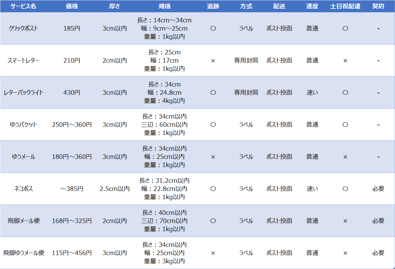 厚さ2cm以内という制限はありますが、300g以内は168円で送れる魅力的なサービスです。