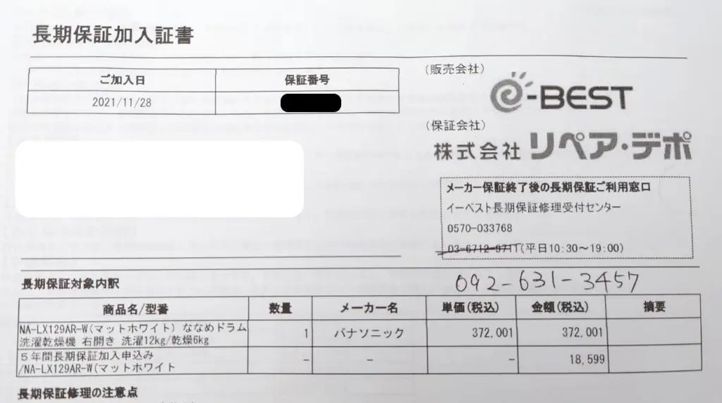 私はドラム式洗濯乾燥機のネット購入を推しておりますが、私もネット購入時にヤマダ系列の長期保証がつけられる店舗で買いました。