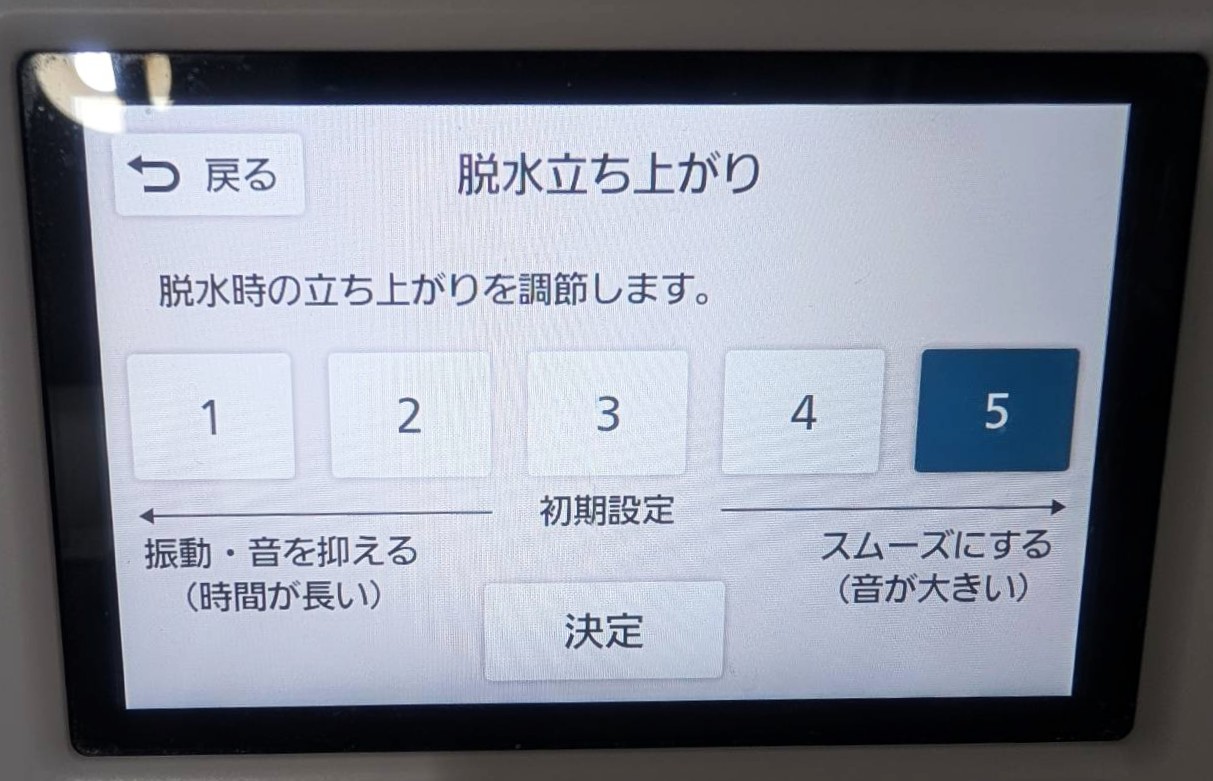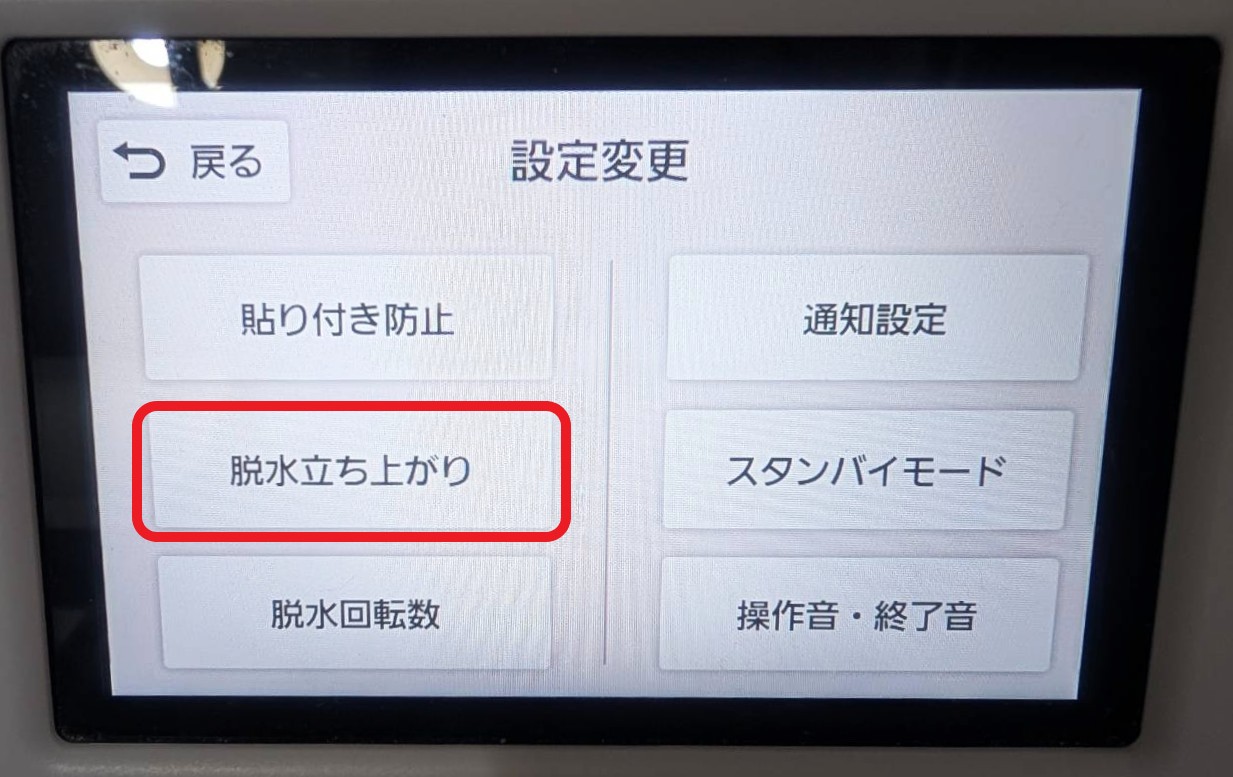 設定➡「脱水立ち上げり」と進み、立ち上がりの大きさを確認しましょう。
