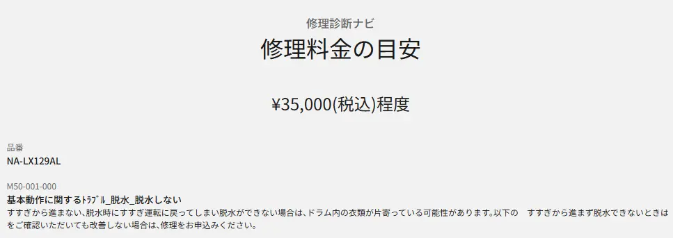 Panasonicではドラム式洗濯機をはじめ、各家電の修理料金の目安を調べられる修理診断ナビというサービスがあります。