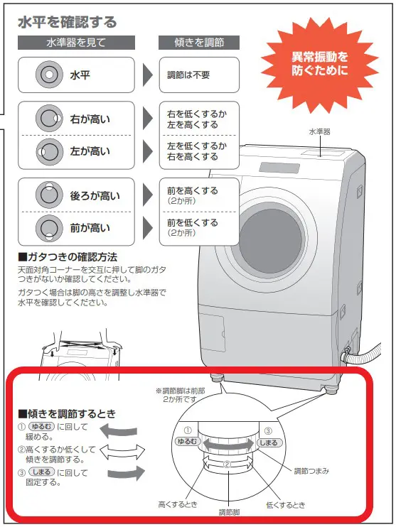 洗濯機が水平でない場合には、脚の高さを調節しましょう。