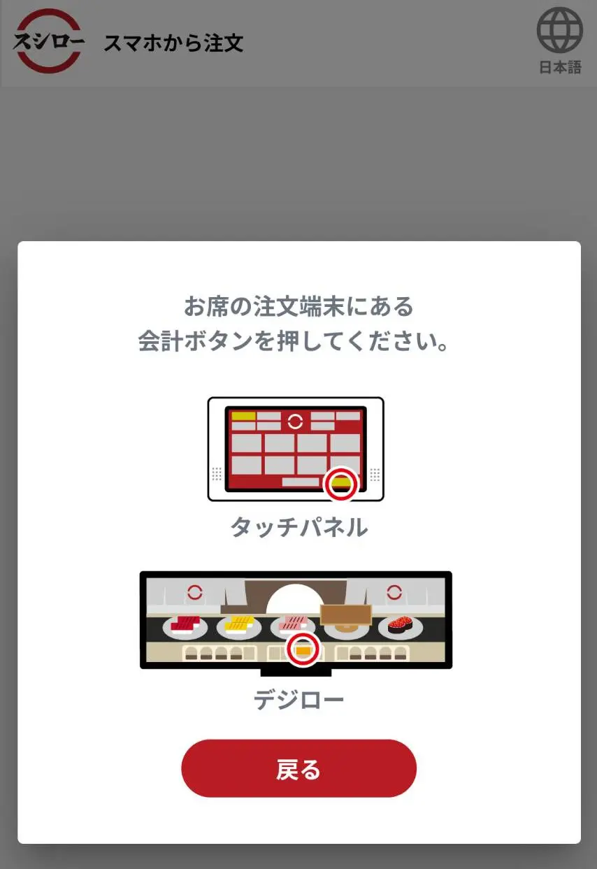 タッチパネルまたはデジローから会計するように促され、スマホ画面からは会計ボタンを押すことが出来ない仕様です。