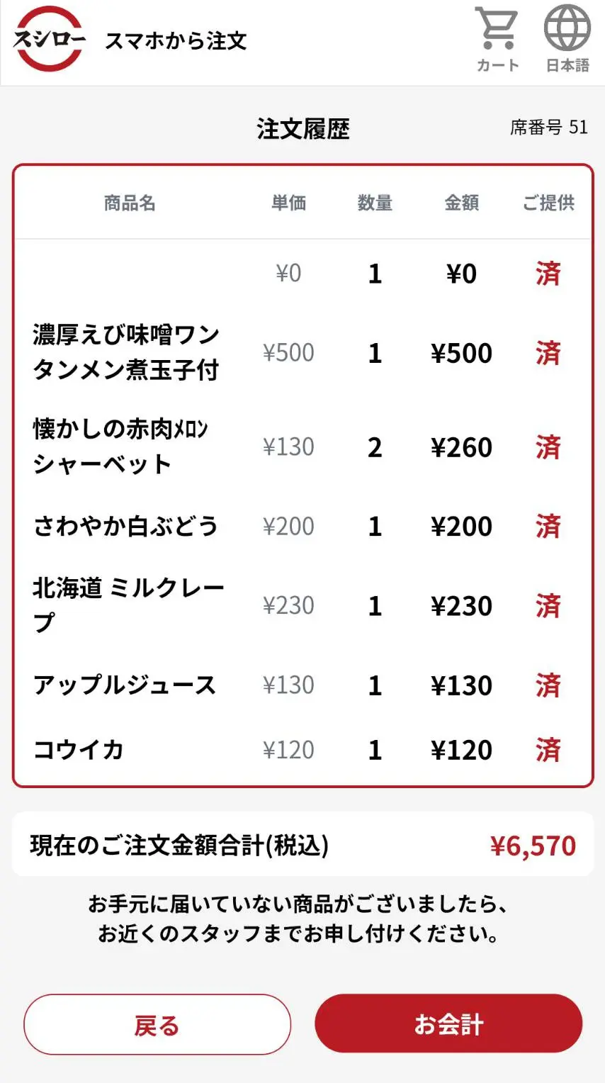 もちろん注文履歴は席単位なので、画面で注文したものと各々のスマホで注文したものの合計が表示されます。