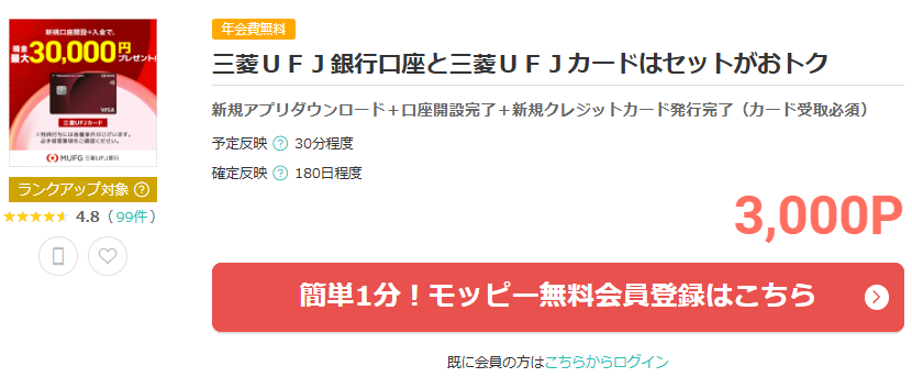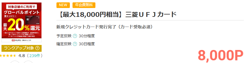 例えば本記事作成時点(2026年1月29日)では、モッピーというポイントサイトを経由して「三菱UFJカード」を作成すると、公式特典とは別に8,000円相当のポイントが獲得できます。