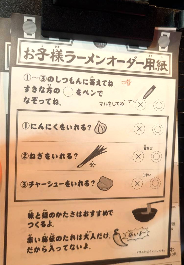 人数分の「お子様ラーメンオーダー用紙」がもらえます。
