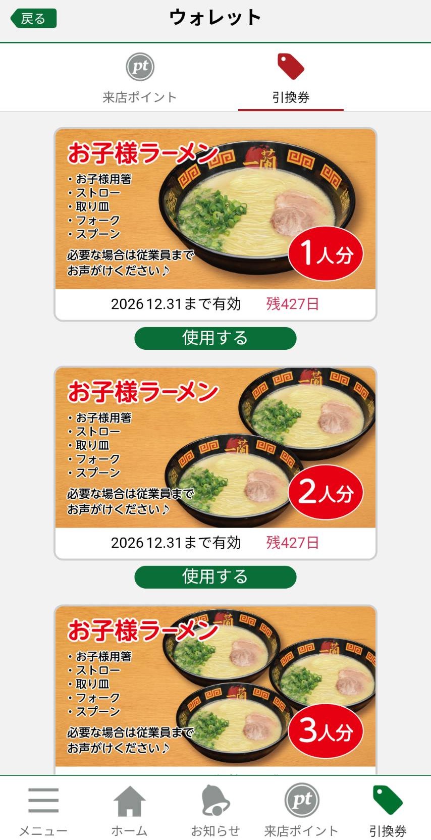 一蘭アプリのインストール+会員登録さえ済んでいれば、お子様ラーメン引換券が表示されるので、確実に登録を済ませておきましょう。
