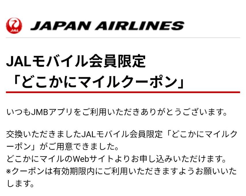 また交換した「どこかにマイルクーポン」は、JMBアカウントに紐づいているため、JALモバイル利用者本人のみの利用です。