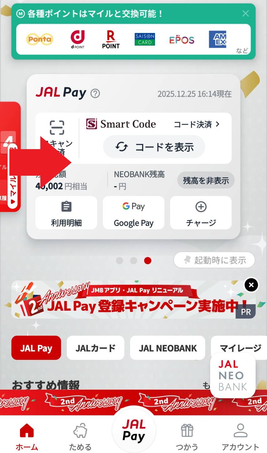 ①まずは上部をJALペイにスライド(起動時に表示をONで固定化可能)