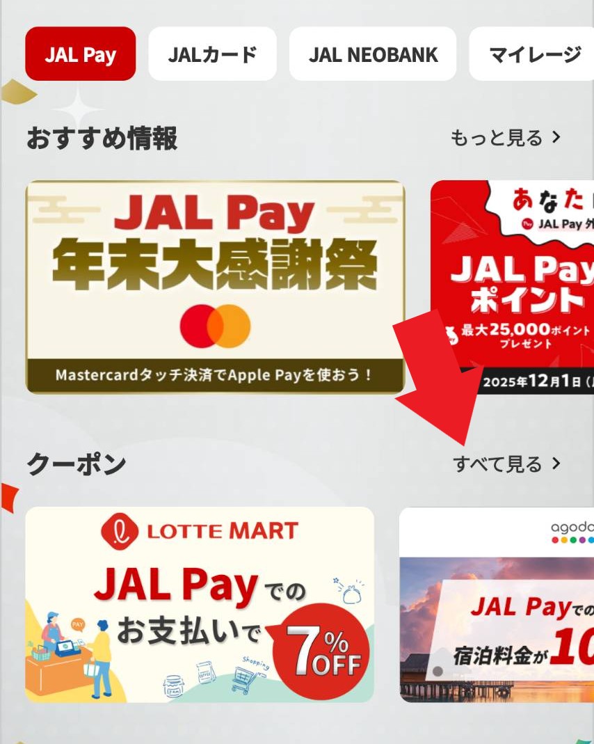 JALPayを選択すると、下に「クーポン」という項目が表示されるので、「すべてを見る」をタップします。