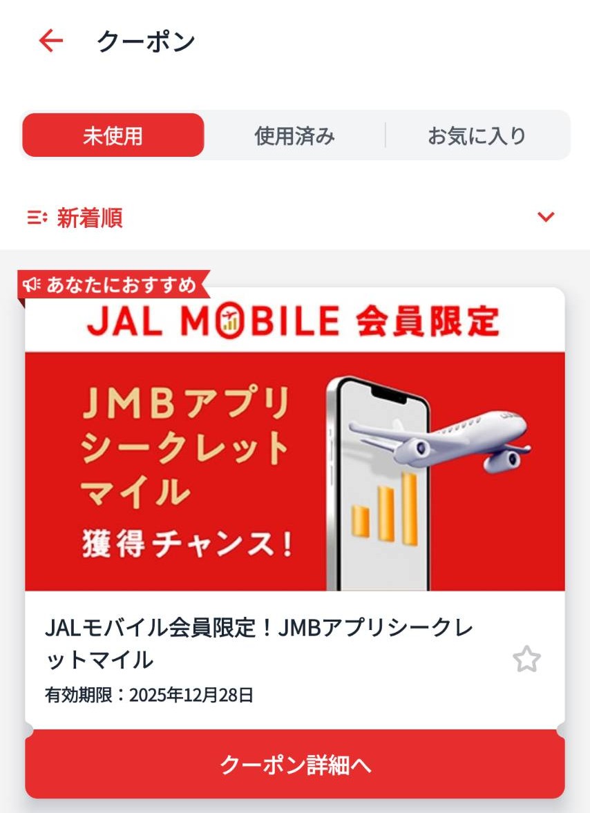 未使用クーポンにシークレットマイルが来ていたら、「クーポン詳細へ」をタップします。