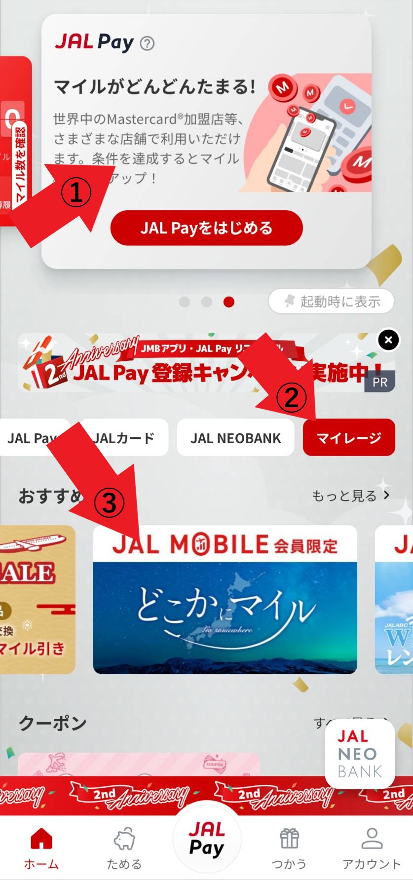 ③おすすめ情報を右にスライドすると表示される「JAL MOBILE会員限定 どこかにマイル」をタップ