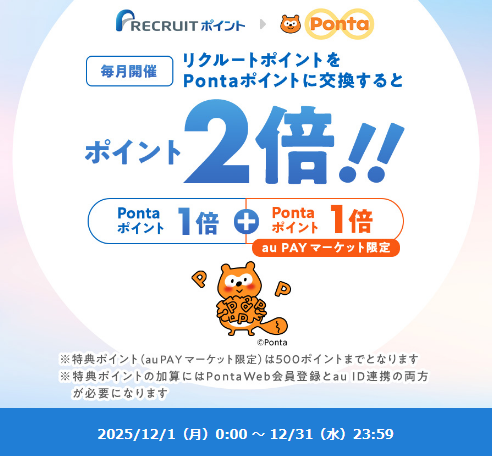 また、本記事更新時点では毎月リクルートポイントをPontaポイントに2倍で交換できます。