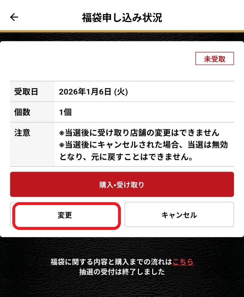応募時に受取り店舗を指定する必要があったのですが、いつも混んでいる近隣の店舗に応募した私は外れ、いつも空いている店舗に応募した家族は当選していました。
