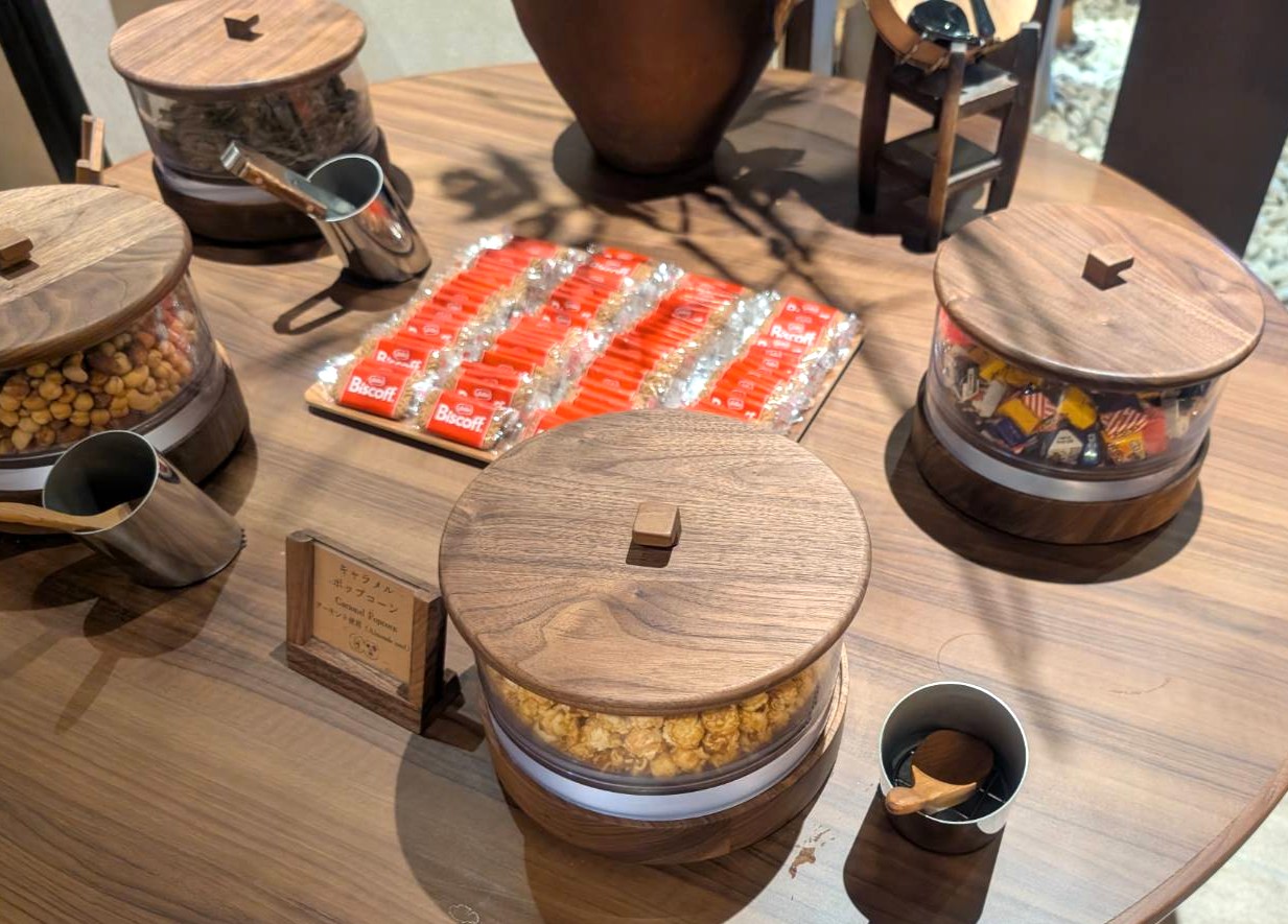 こちらには「おしゃぶり昆布、ミックスナッツ、キャラメルポップコーン、チロルチョコ、ビスケット」があり、種類豊富なチロルチョコに子供は大喜び!