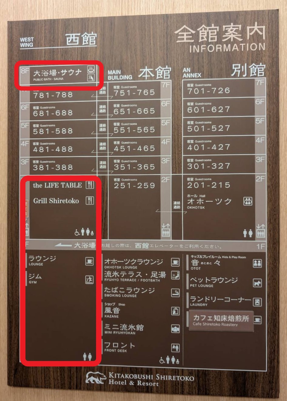 露天風呂付の部屋はどれも「西館」(温泉付きは本館にあり)にありますが、大浴場・レストラン・ジムと、多くが西館に揃っているためとても便利です。