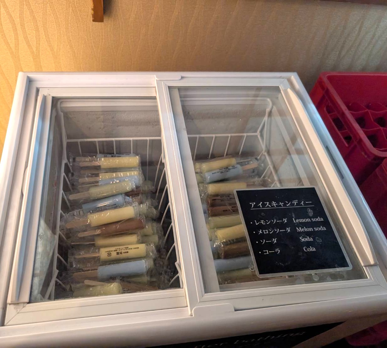 湯上りアイスと瓶牛乳もあります(もちろんオールインクルーシブなのでこれも無料)。