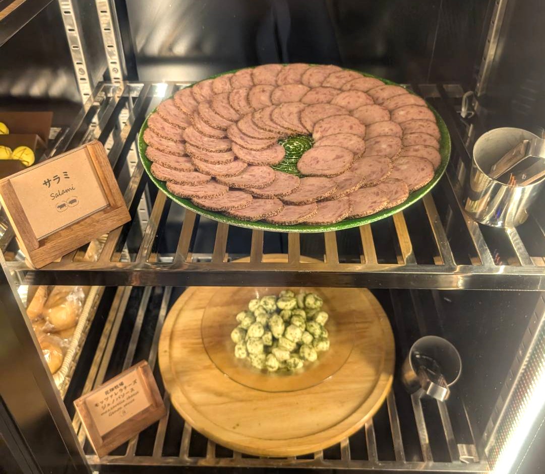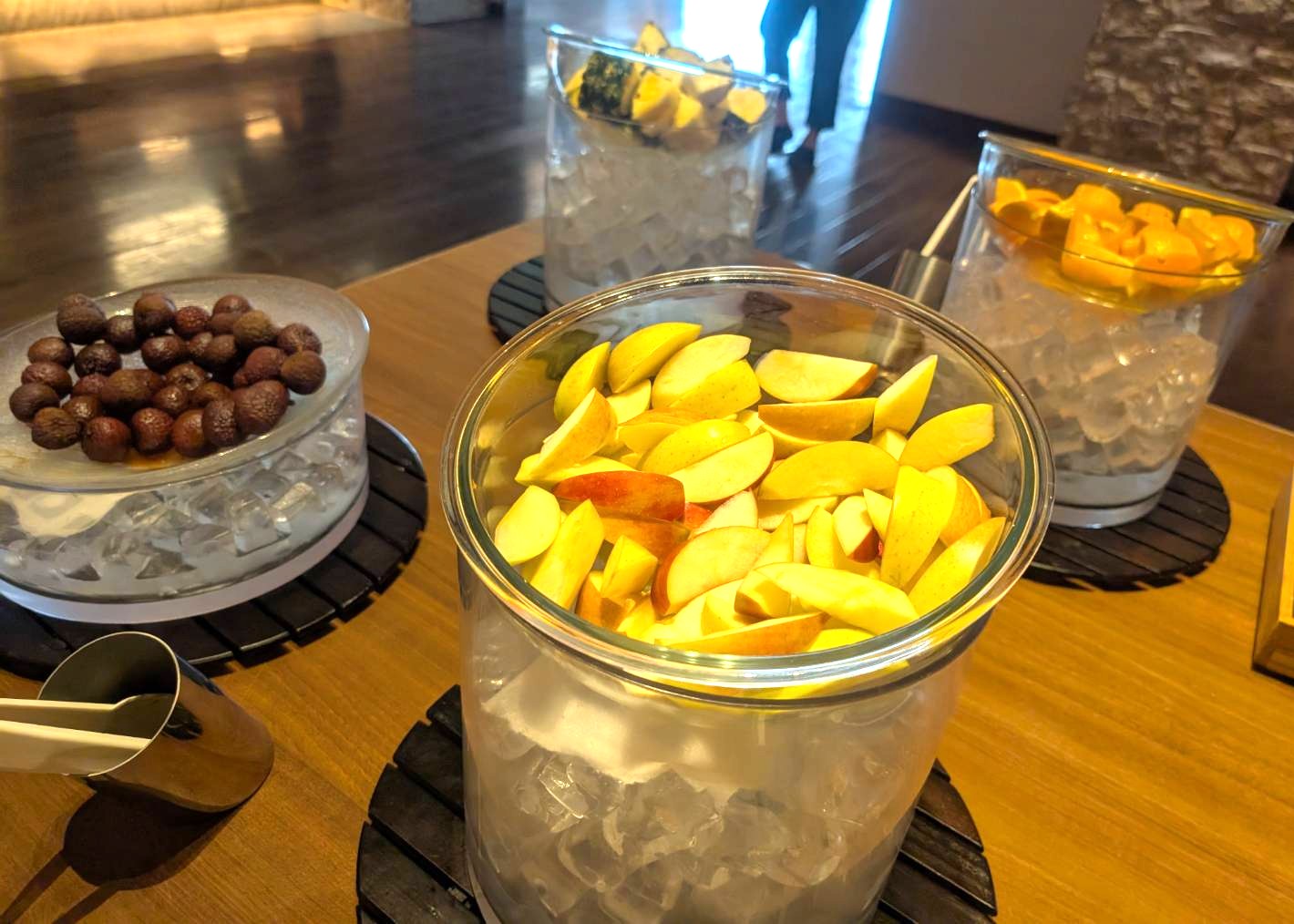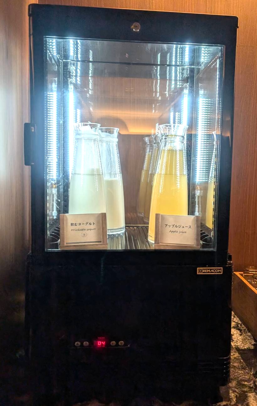 一方、朝のラウンジはアルコールの提供はないため、ビールサーバーはふさがれており、スパークリングワインは「飲むヨーグルト」と「アップルジュース」に替わっていました。