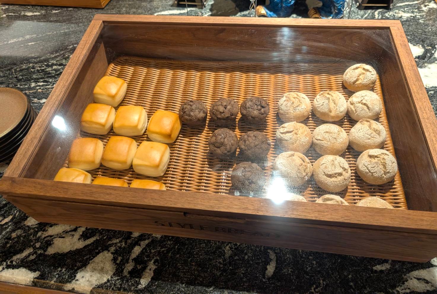 さらに、ピクルスとオリーブが消えて、プチパンコーナーと化していました(お菓子・デザート類は夜と同じ)。