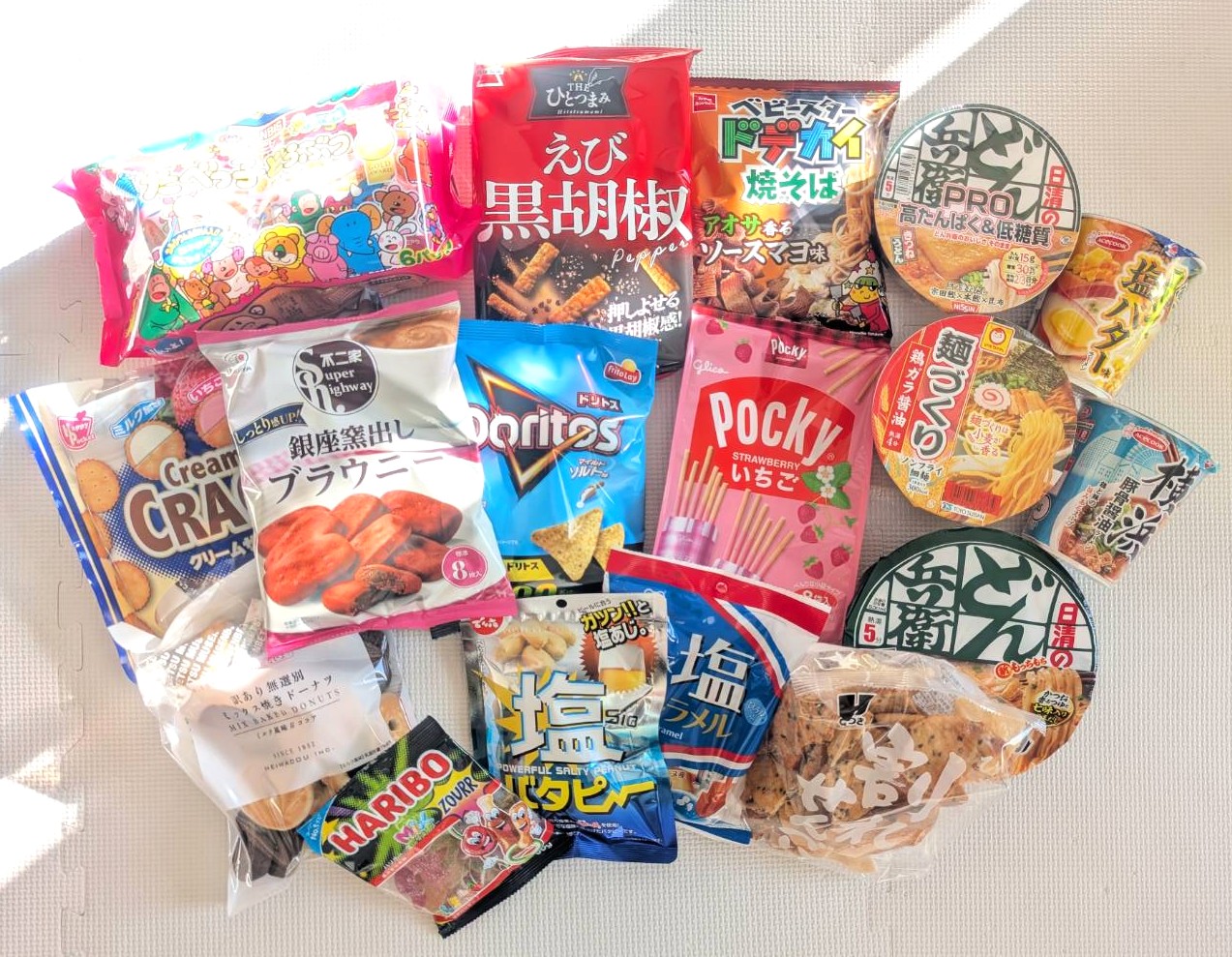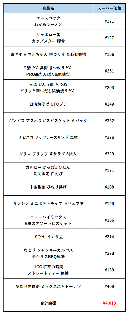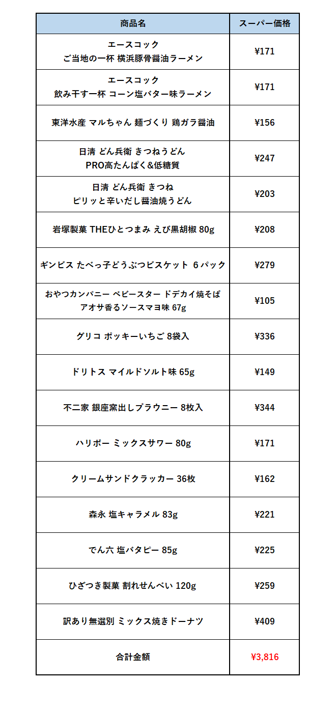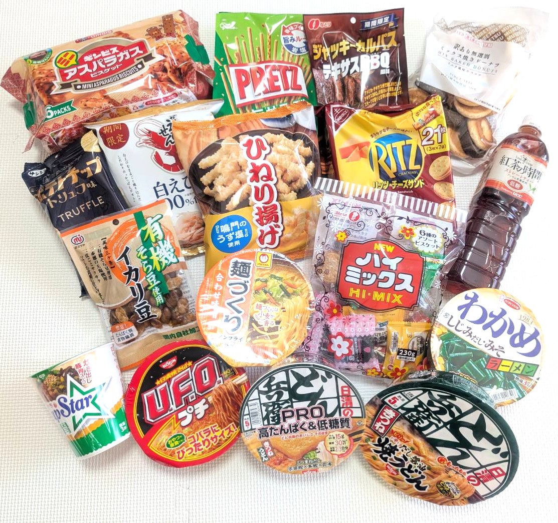 今回はカップ麺多めですが、お菓子類も無難な味のものが多くて助かりました。