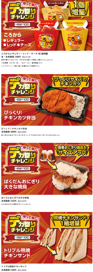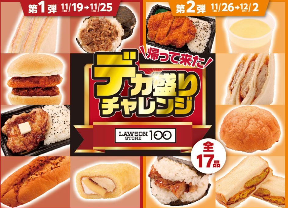 ローソン100では、2025年11月19日~12月2日の期間で「デカ盛りチャレン」が開催されます。