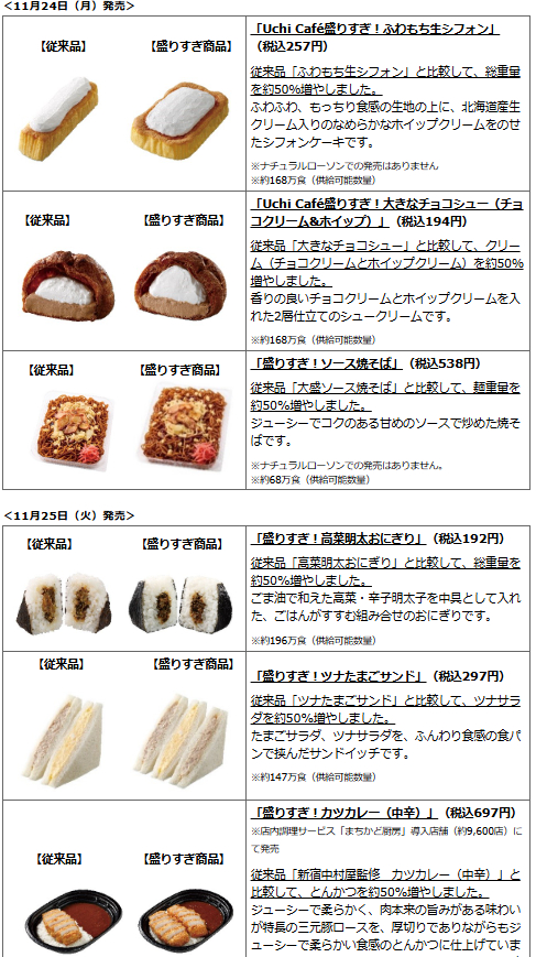 2024年6月10日からはローソンで「盛りすぎチャレンジ」と称し、11種類の「お値段そのままで47%増量」が始まります。