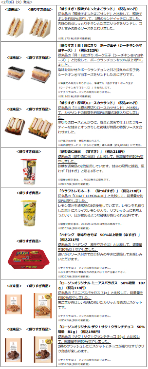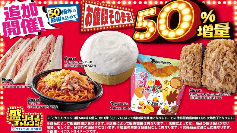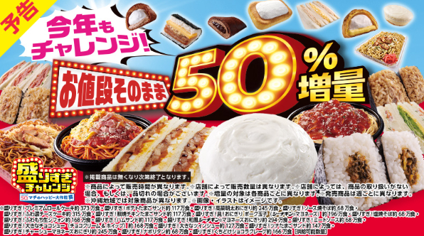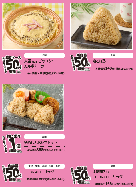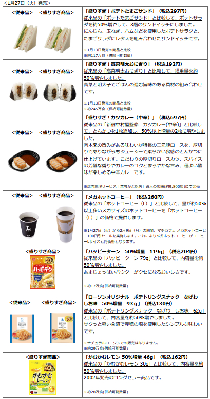 本記事更新時点(2024.2.5)ではローソンで「盛りすぎチャレンジ」と称し、19種類の「お値段そのままで47%増量」を行っています。