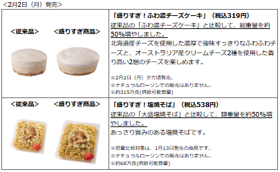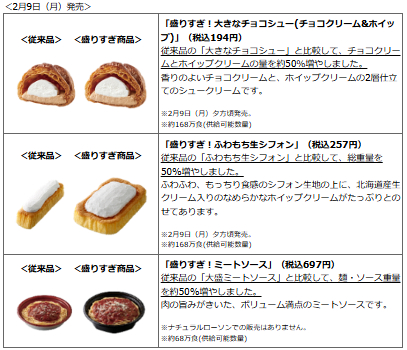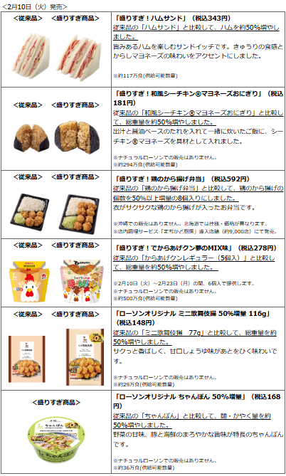 ローソンでもファミリーマートの増量キャンペーンの反響を受けて、2023年2月に一部商品において「価格は据え置きで重量を約47%増」とする「盛りすぎ!チャレンジ」を実施しています。