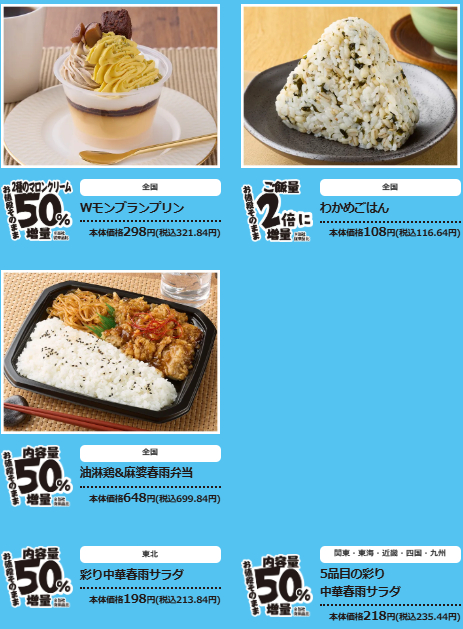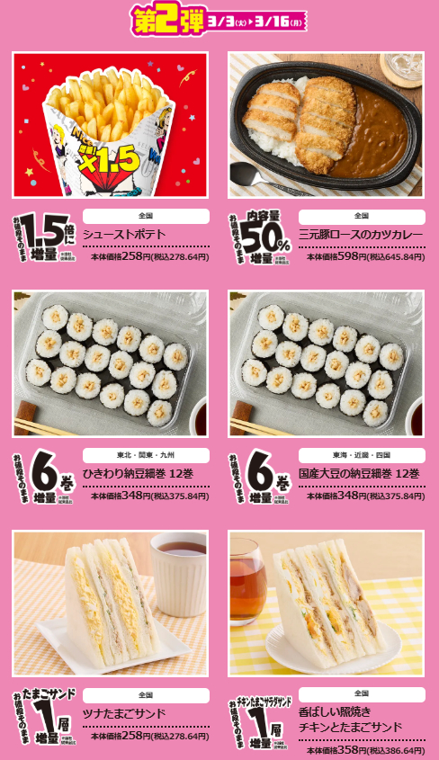 「でからあげくん」「プレミアムロールケーキ」「おにぎり」等、人気商品の増量が見逃せません。