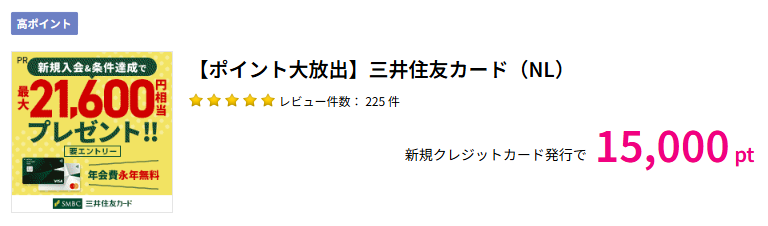 ノーマルカードの三井住友カードNLはハピタスで、公式特典の最大21,600円相当とは別に、15,000円相当のポイント、合計で最大36,600円相当が獲得できます。
