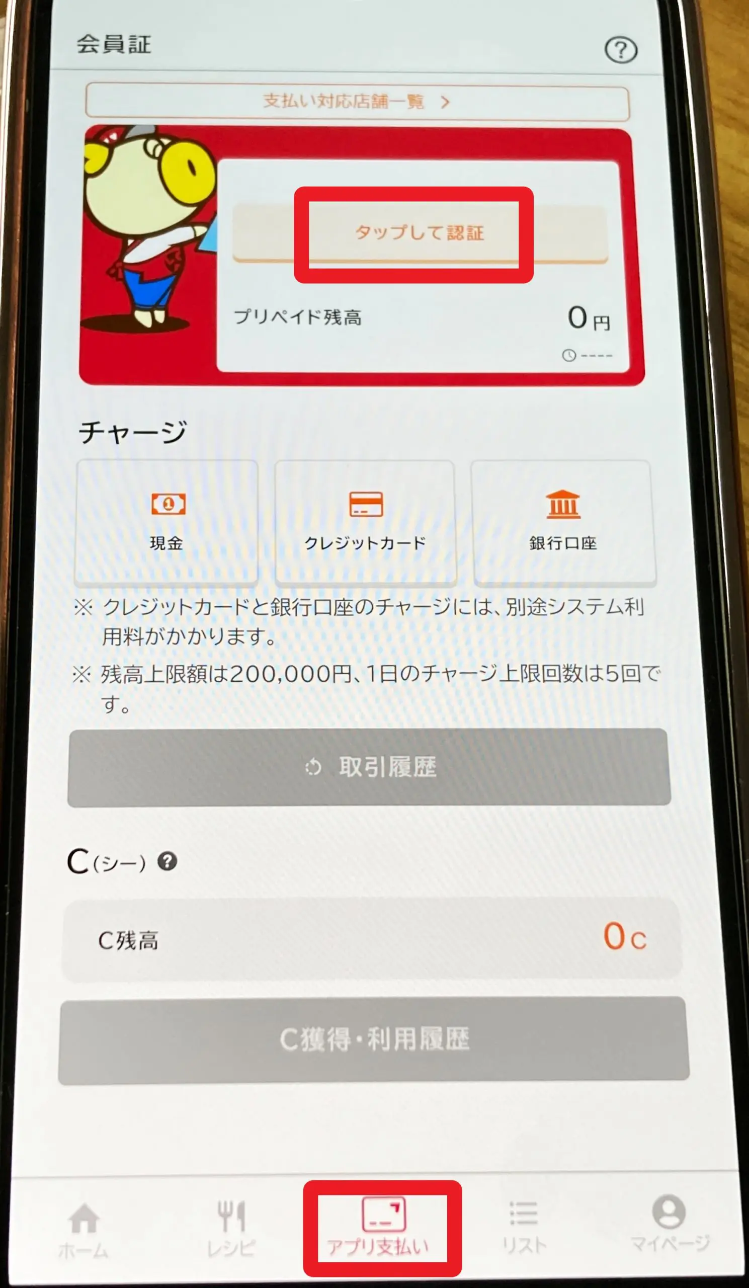 会員登録が済んだら、公式アプリの「アプリ支払い」タブから「タップして認証」を選択し、