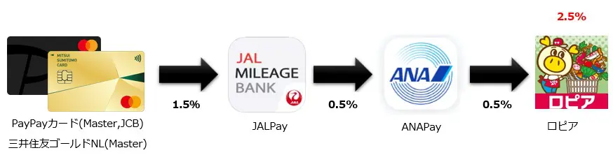 更に手間をかければもうちょっと還元率が増やせます。代表的なルートは「クレジットカード➡JALPay➡ANAPay➡ロピア」です。