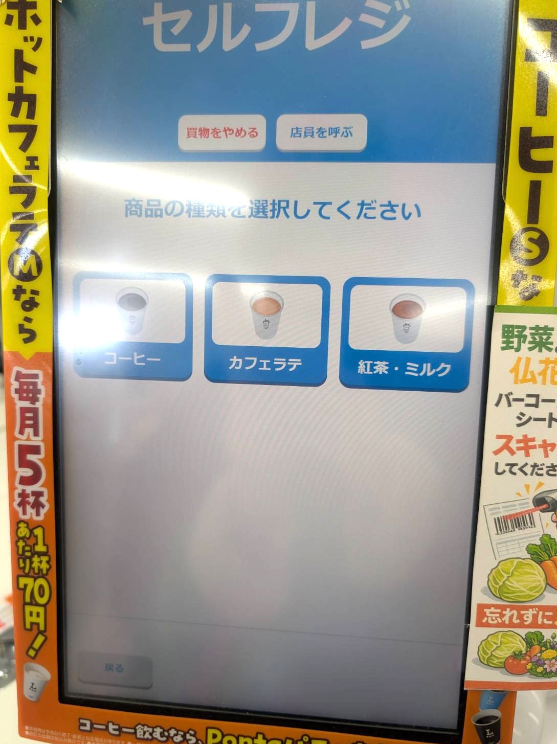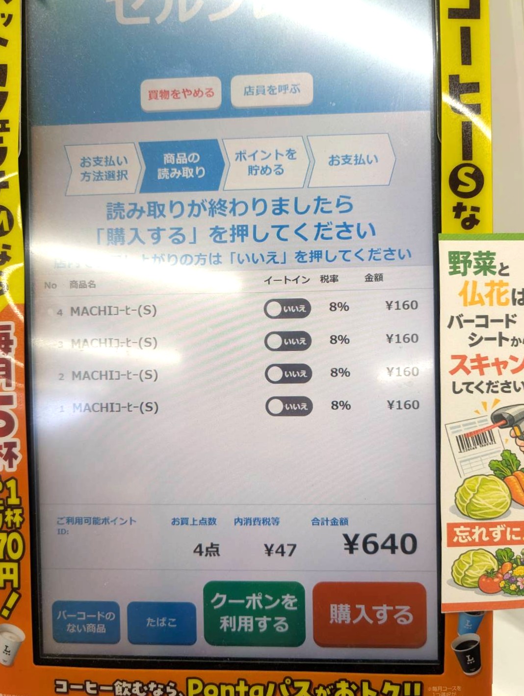 Pontaパス会員のコーヒー無料クーポンも、セルフレジで難なく使えました!
