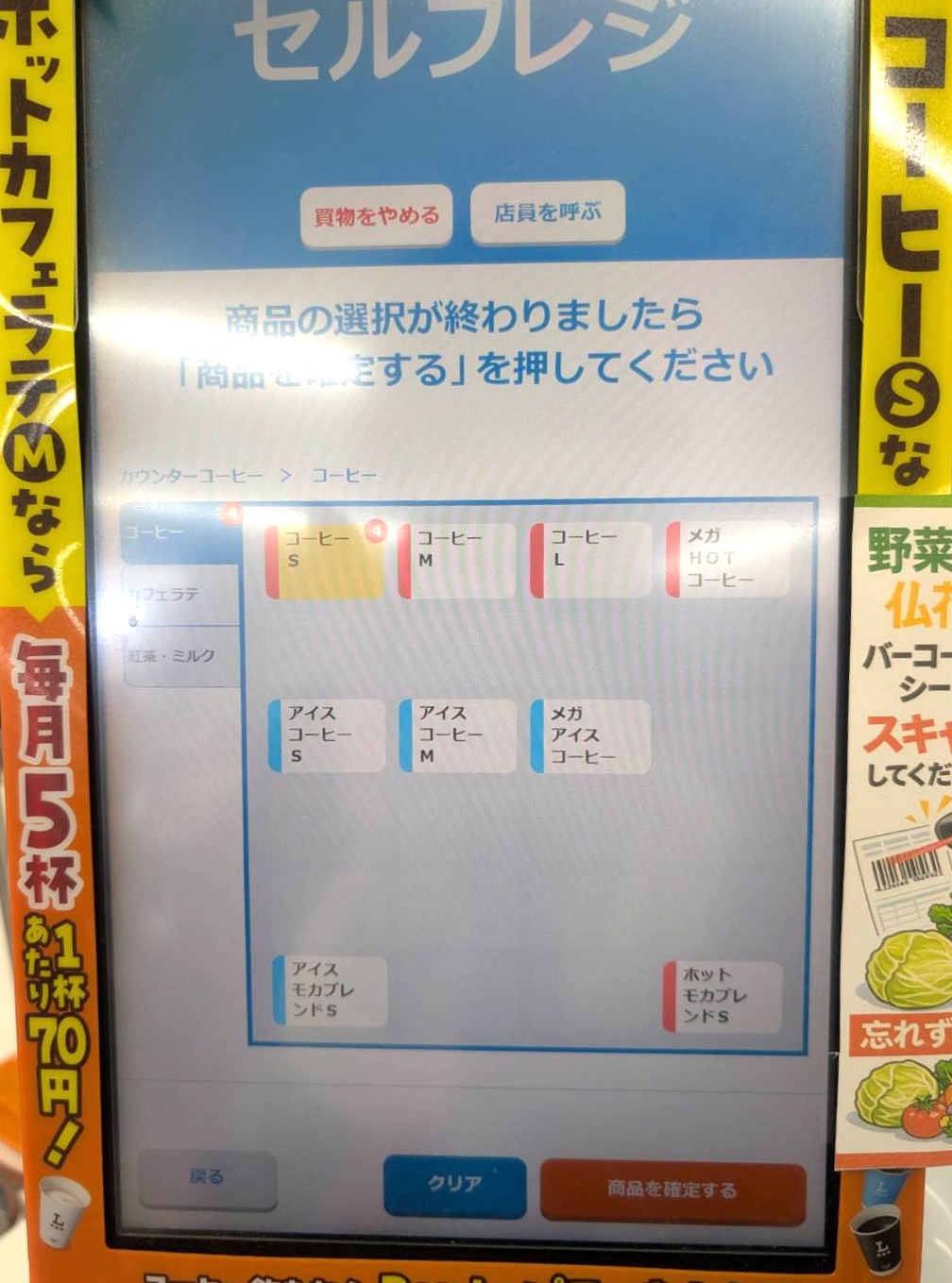 また、コーヒーボタンのないセルフレジ導入店舗では、レジに各コーヒーメニューのコード表が置かれていることが多いため、