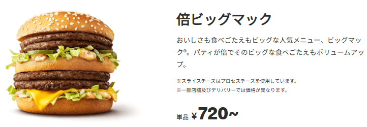 夜マック時間(17:00~)のバーガー最高値メニューは、レギュラーメニューの『倍ビッグマック』720円(準都心店:740円、都心店:780円、特殊立地店:860円)です。