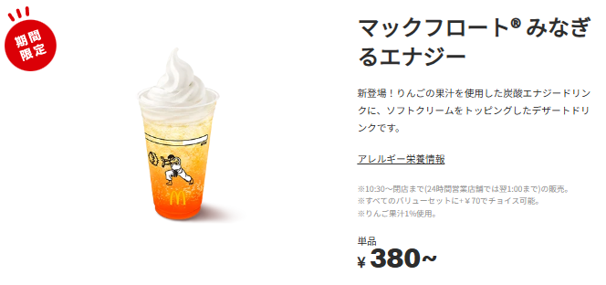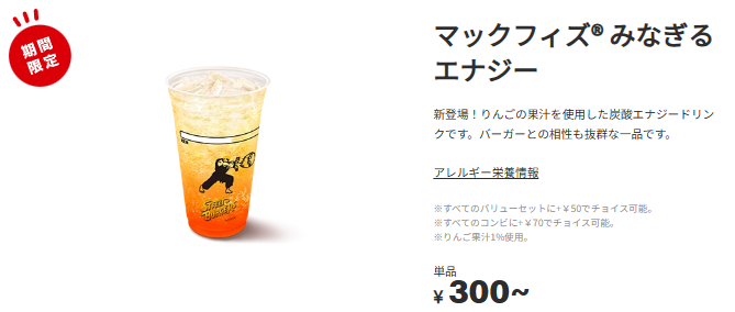 また、お得度は下がりますが10月22日からは期間限定『マックフィズ® みなぎるエナジー』300円(準都心店:310円、都心店:330円、特殊立地店:360円)が発売中です。