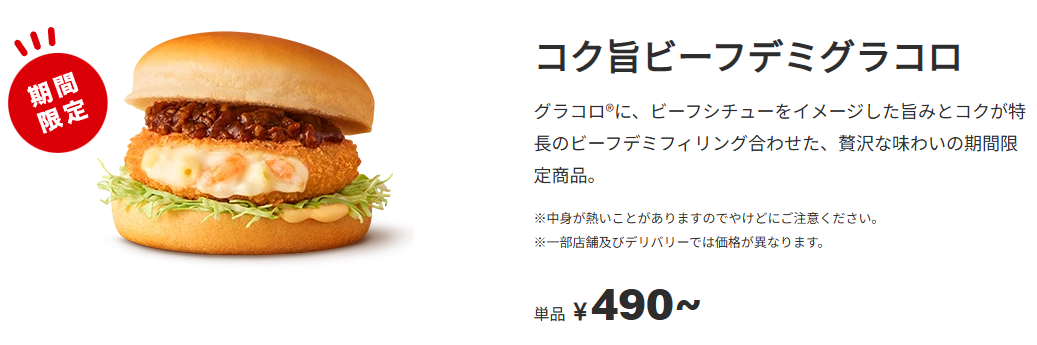 - 『コク旨ビーフデミグラコロ』:490円(準都心店:510円、都心店:550円、特殊立地店:590円)