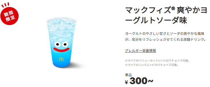 また、お得度は下がりますが1月7日からは期間限定『マックフィズ® 爽やかヨーグルトソーダ味』300円(準都心店:310円、都心店:330円、特殊立地店:360円)が発売中です。