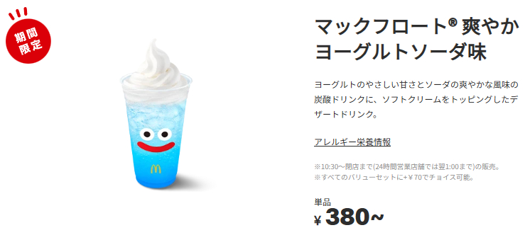レギュラー・夜マック時間帯のドリンク最高値メニューは1月7日からの期間限定『マックフロート®爽やかヨーグルトソーダ味』380円(準都心店:390円、都心店:420円、特殊立地店:460円)です。