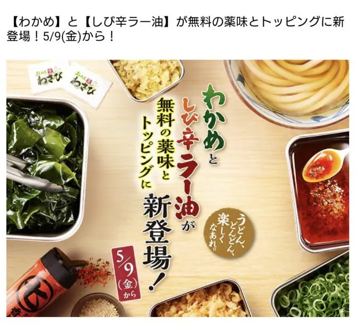 2025年5月9日より、丸亀製麺で「わかめ」と「しび辛ラー油」が無料のトッピング、薬味として新登場しました。