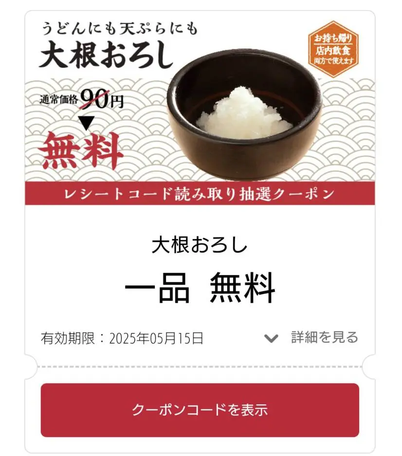 ちなみに有料トッピングの代表格「大根おろし」はレシートのQRコード読み取りで無料クーポンが貰えることが多いです!
