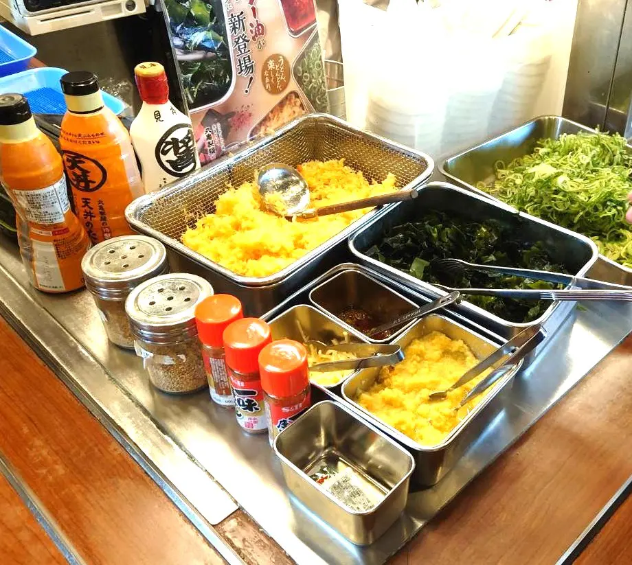 店舗により、薬味等の持ち帰り方法は異なる場合がありますが、お持ち帰り台にある使い捨ての容器に、天かすやネギなどを入れて持ち帰ることが出来ます。