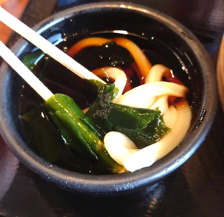 さらに、丸亀製麺では「かけダシ」が自由に利用できるため、「かけダシ+わかめ」をすればわかめスープのような美味しさにもなりますし、ここにうどんを入れれば「温かいわかめうどん」の完成です。